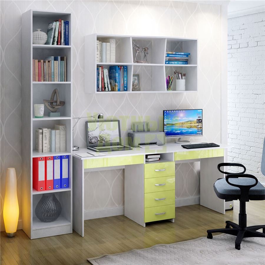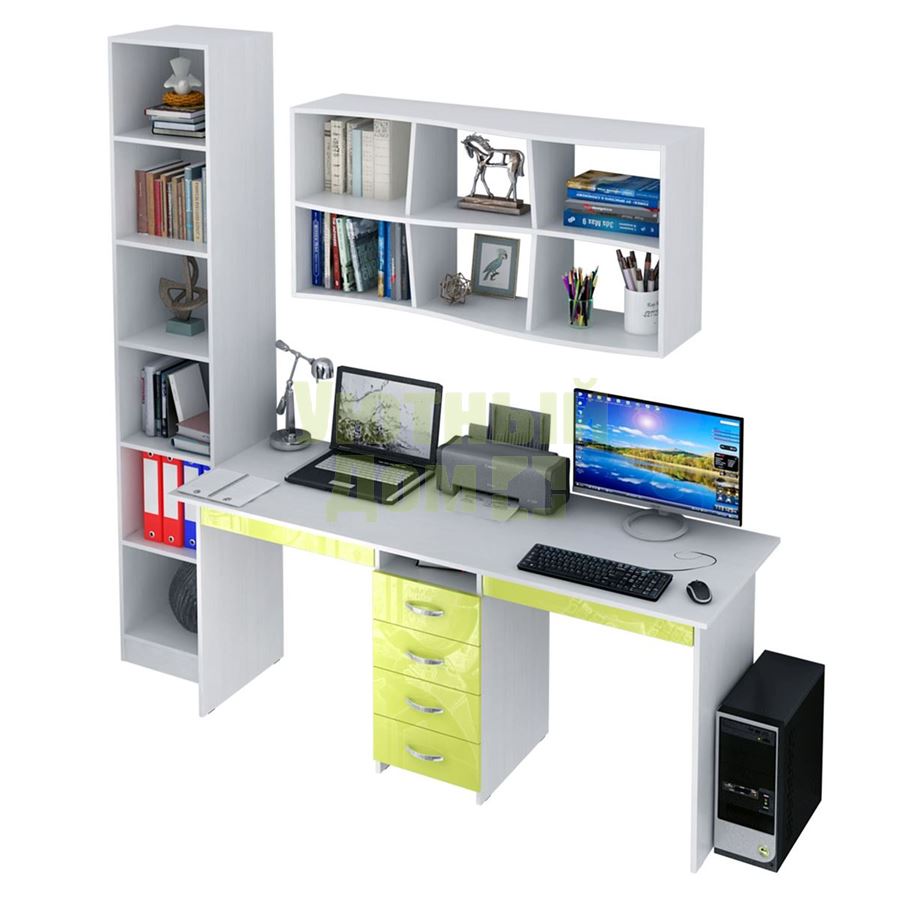 Каждый элемент возможно приобрести по отдельности. Состав комплекта: стол Тандем-2Я Глянец (1 шт.), полка Вэйв-9 (1 шт.), стеллаж Либерти-4 (1 шт.).