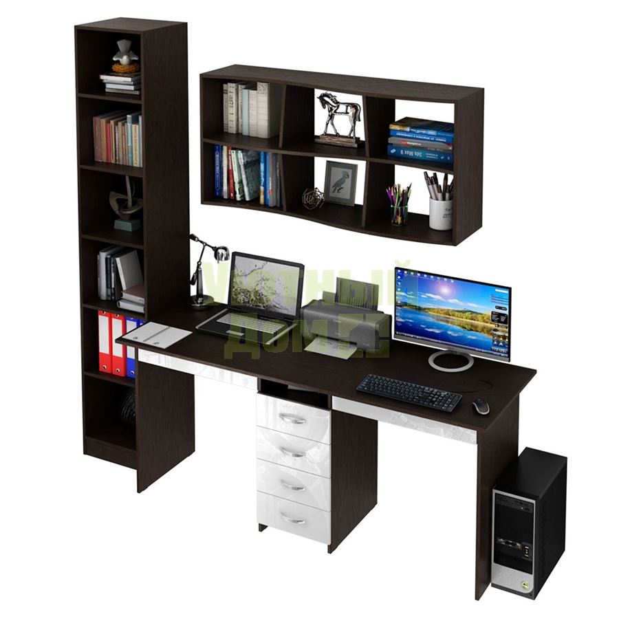 Сборку данного товара желательно осуществлять вдвоем во избежание травмоопасных си...читать ещеКаждый элемент возможно приобрести по отдельности. Состав комплекта: стол Тандем-2Я Глянец (1 шт.), полка Вэйв-9 (1 шт.), стеллаж Либерти-4 (1 шт.).