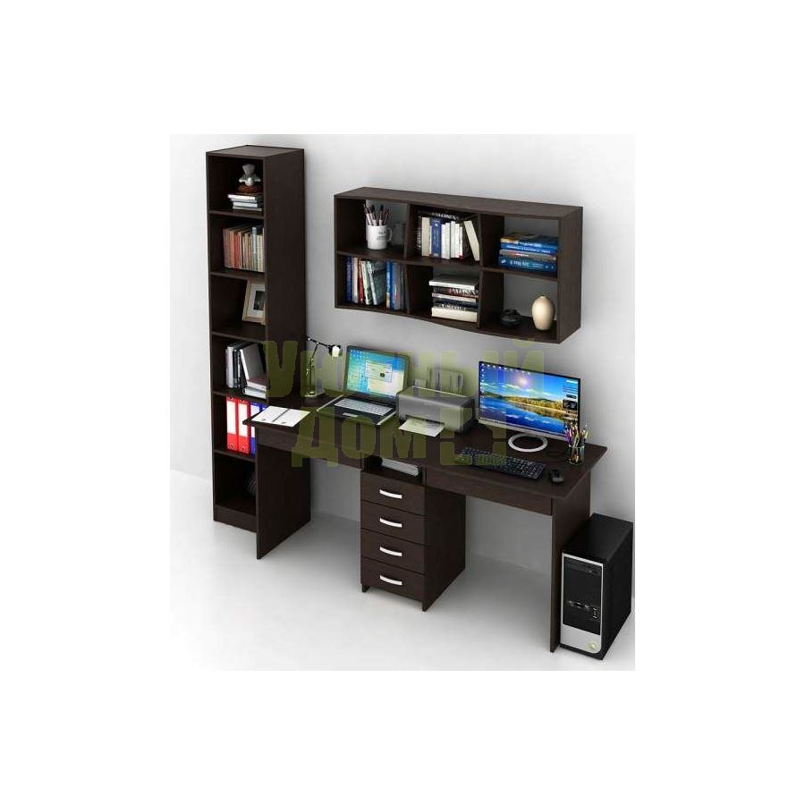 Каждый элемент возможно приобрести по отдельности. Состав комплекта: стол Тандем-2Я (1 шт.), полка Вэйв-9 (1 шт.), стеллаж Либерти-4 (1 шт.).