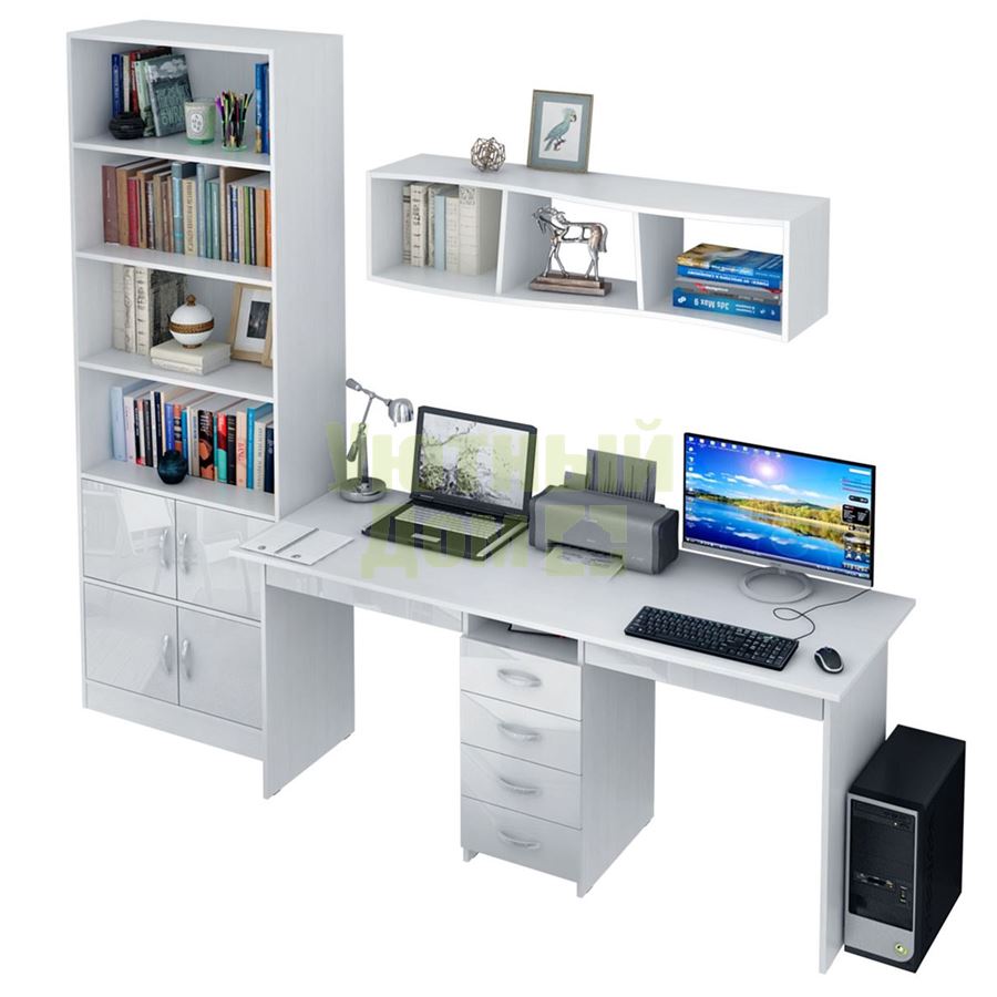 Каждый элемент возможно приобрести по отдельности. Состав комплекта: стол Тандем-2Я Глянец (1 шт.), полка Вэйв-8 (1 шт.), стеллаж Либерти-5 (1 шт.), дверка для стеллажей Либерти Глянец (4 шт.).