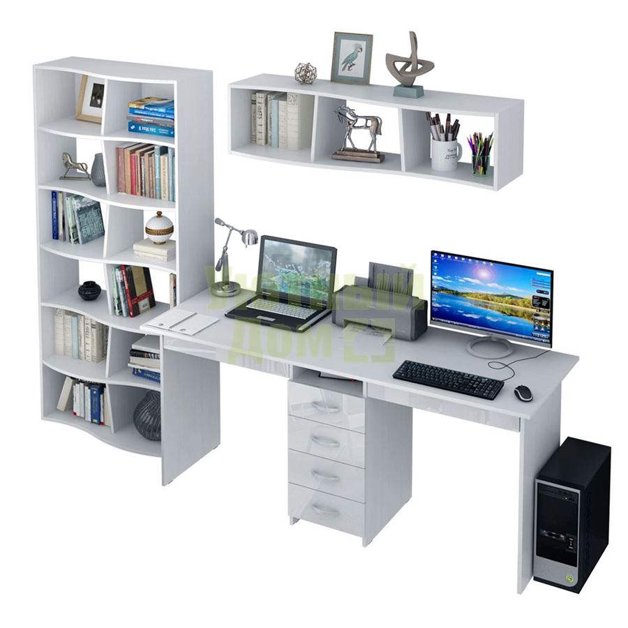 Каждый элемент возможно приобрести по отдельности. Состав комплекта: стол Тандем-2Я Глянец (1 шт.), полка Вэйв-8 (1 шт.), стеллаж Вэйв-1 (1 шт.).