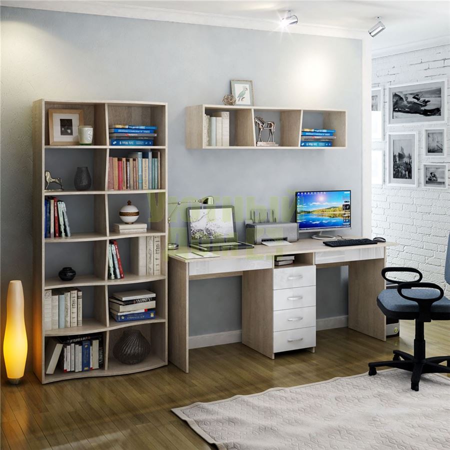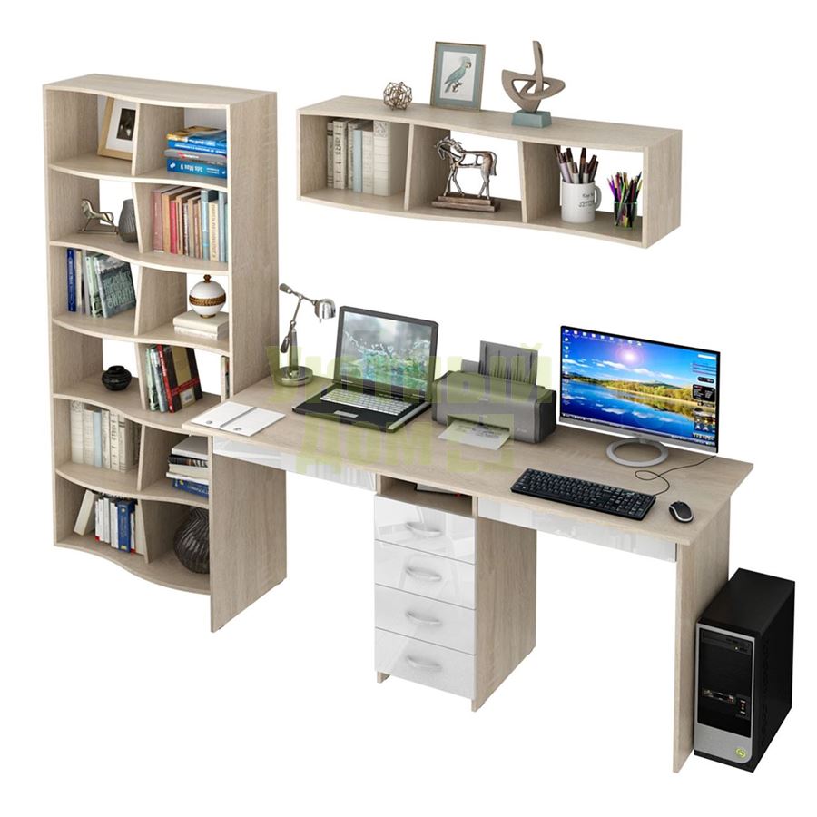 Каждый элемент возможно приобрести по отдельности. Состав комплекта: стол Тандем-2Я Глянец (1 шт.), полка Вэйв-8 (1 шт.), стеллаж Вэйв-1 (1 шт.).