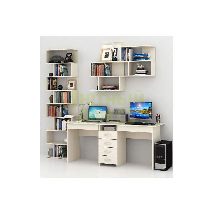 Каждый элемент возможно приобрести по отдельности. Состав комплекта: стол Тандем-2Я (1 шт.), полка Файн-12 (2 шт.), стеллаж Файн-2 (1 шт.).