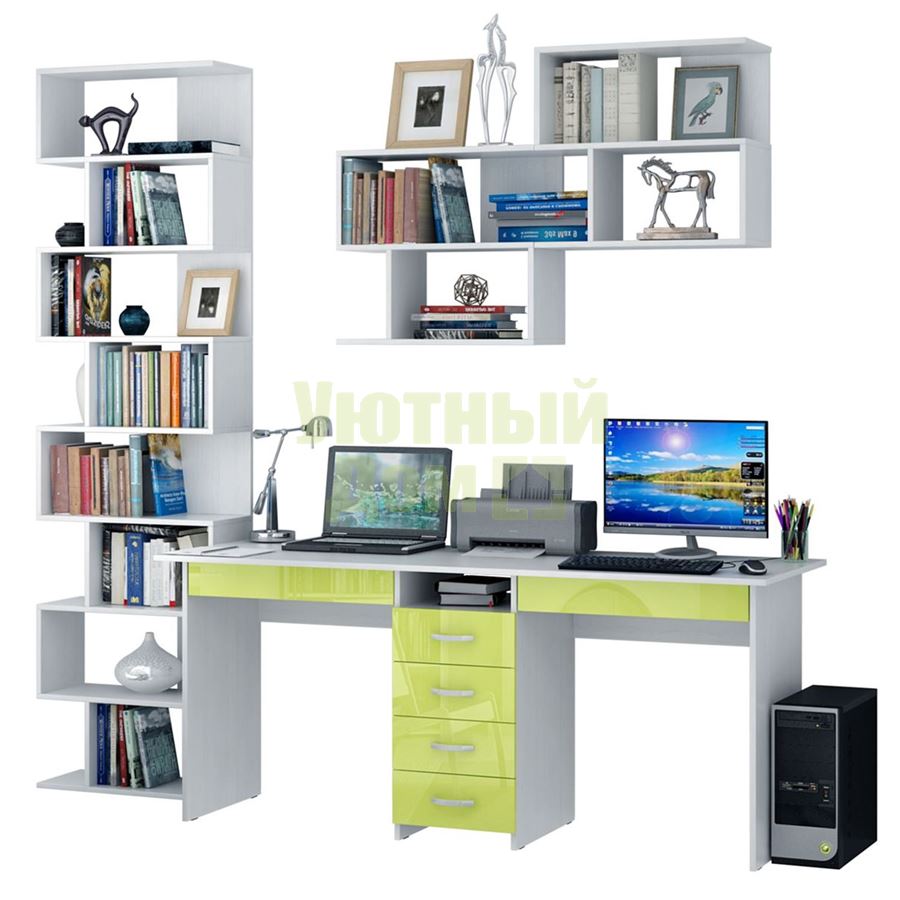Каждый элемент возможно приобрести по отдельности. Состав комплекта: стол Тандем-2Я Глянец (1 шт.), полка Файн-12 (2 шт.), стеллаж Файн-2 (1 шт.).