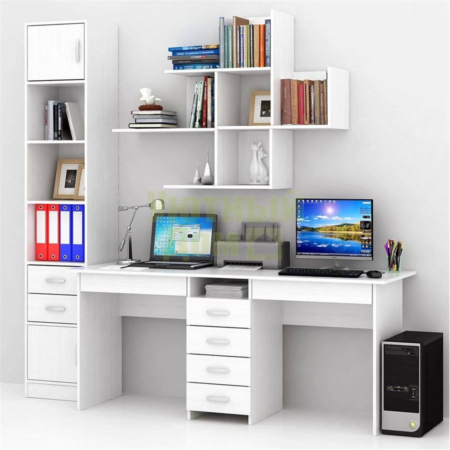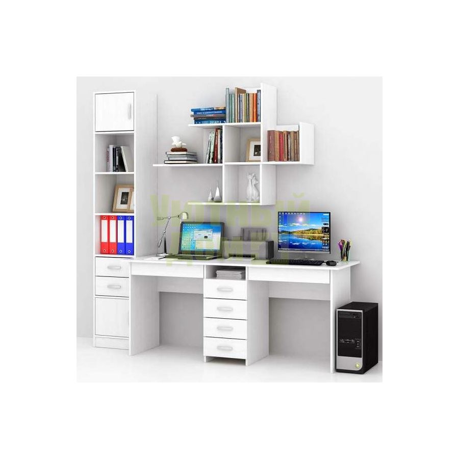 Каждый элемент возможно приобрести по отдельности. Состав комплекта: стол Тандем-2Я (1 шт.), стеллаж Либерти-4 (1 шт.), блок ящиков Либерти малый (1 шт.), дверка для стеллажей Либерти (2 шт.), полка Файн-17 (2 шт.).