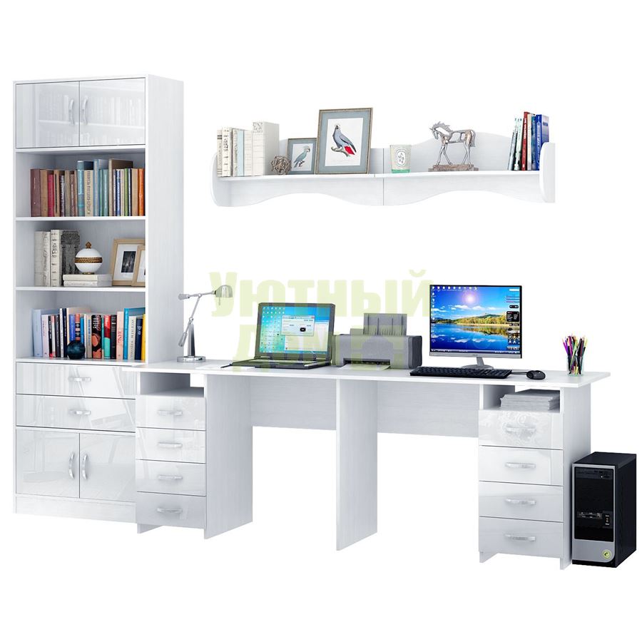 Каждый элемент возможно приобрести по отдельности. Состав комплекта: стол Тандем-3 Глянец (1 шт.), стеллаж Либерти-5 (1 шт.), блок ящиков Либерти большой Глянец (1 шт.), дверка для стеллажей Либерти Глянец (4 шт.), полка Тэя-1 (2 шт.).