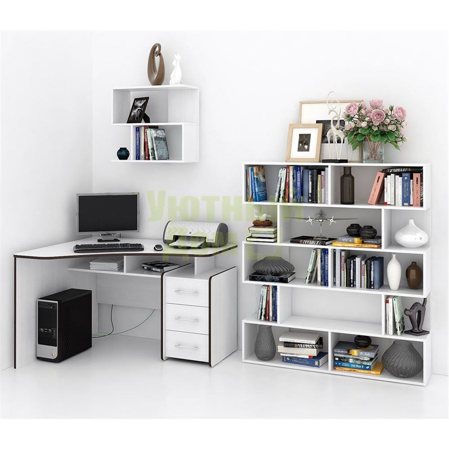 Каждый элемент возможно приобрести по отдельности. Состав комплекта: стол угловой Триан-5 (1 шт.), стеллаж Грас-1 (1 шт.), полка Файн-12 (1 шт.).