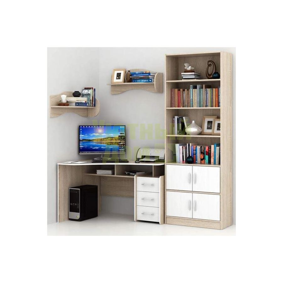 Декоративные заглушки в тон мебели для скрытия технологических отв...читать ещеКаждый элемент возможно приобрести по отдельности. Состав комплекта: стол угловой Триан-5 (1 шт.), стеллаж Либерти-5 (1 шт.), дверка для стеллажей Либерти (4 шт.), полка Тэя-1 (2 шт.).