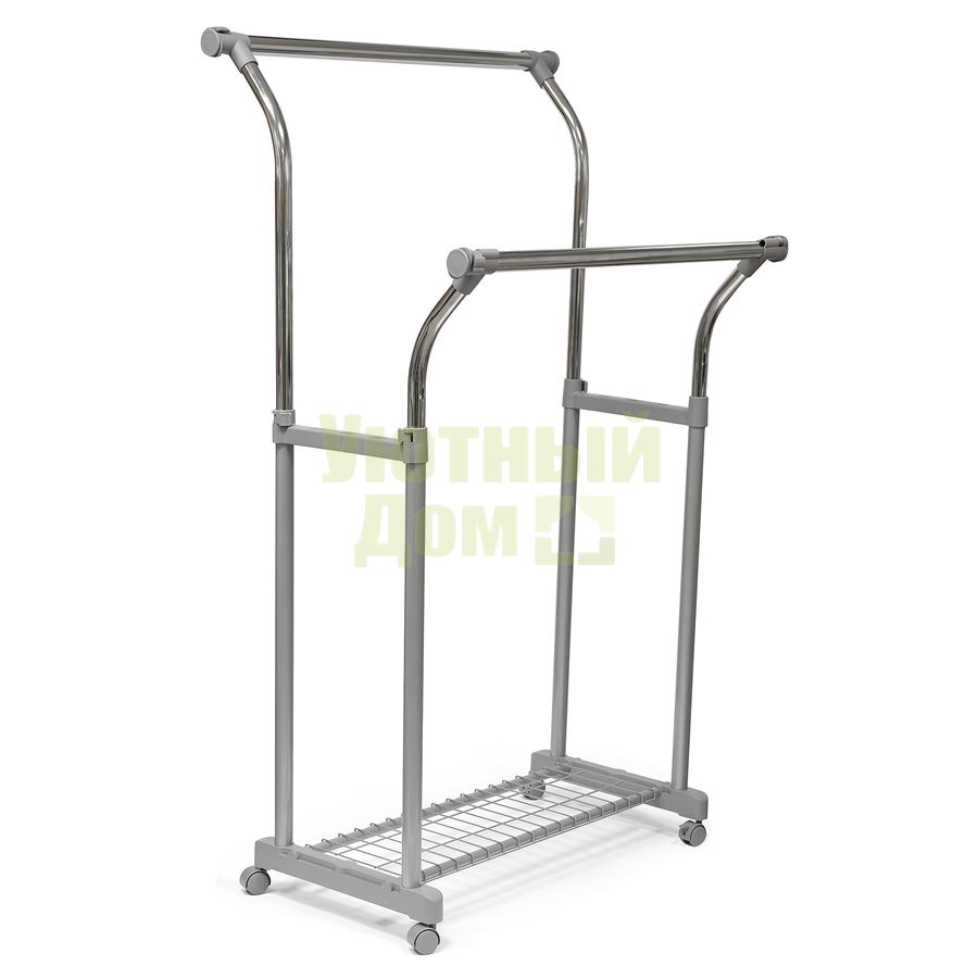 Вешалка для гардеробной комнаты, двойная, раздвижная по высоте и длине, с полкой для обуви, на колесиках. Хромированная сталь, серый пластик, поставляется в 1 кор.
